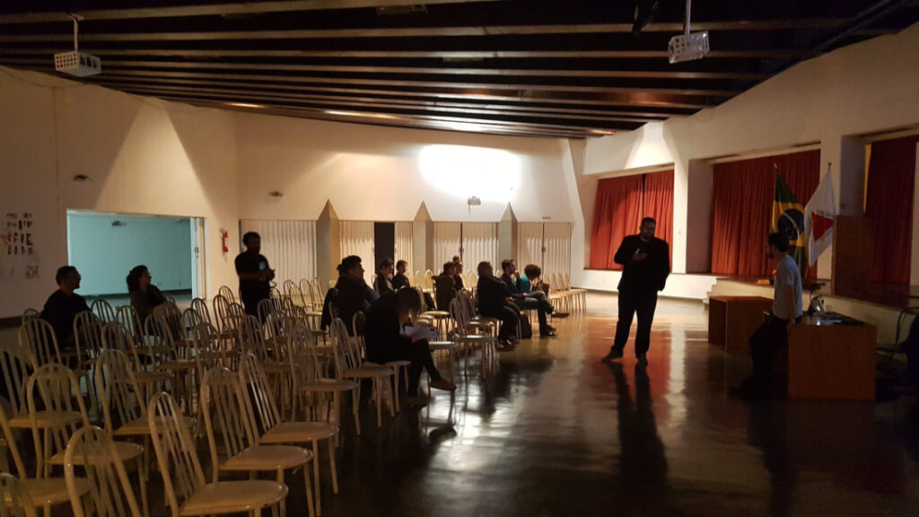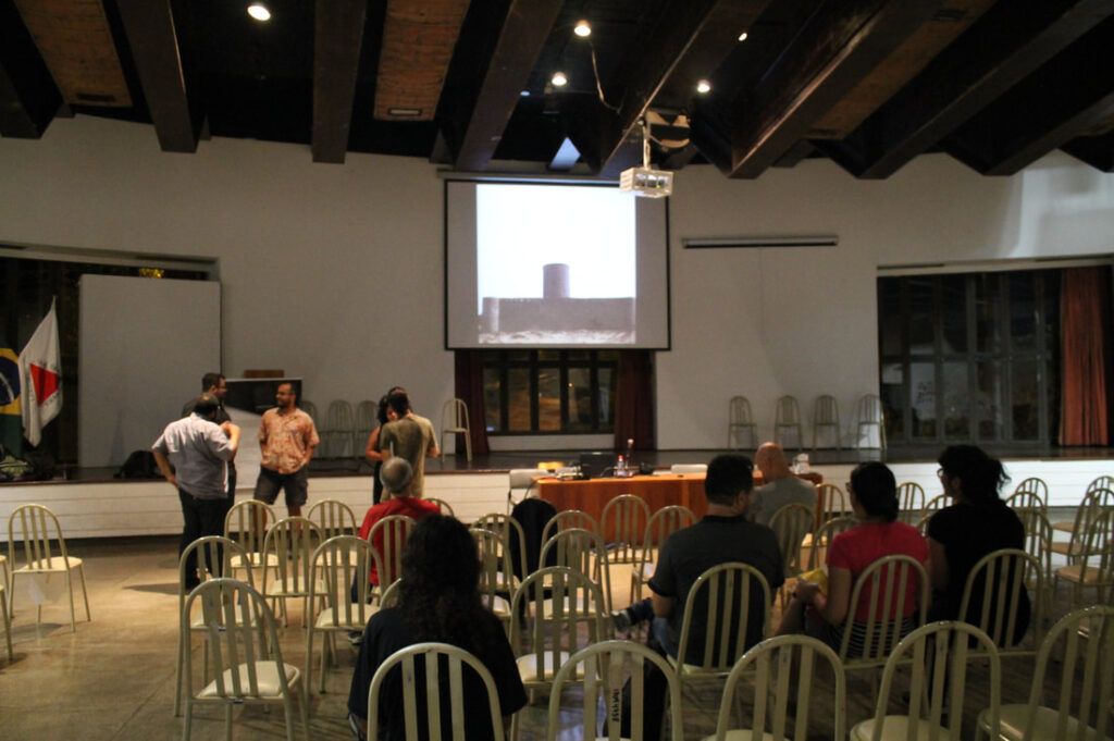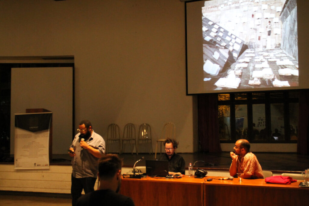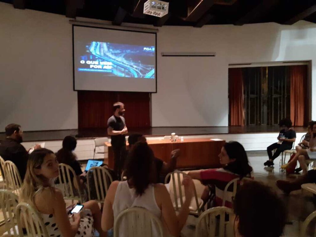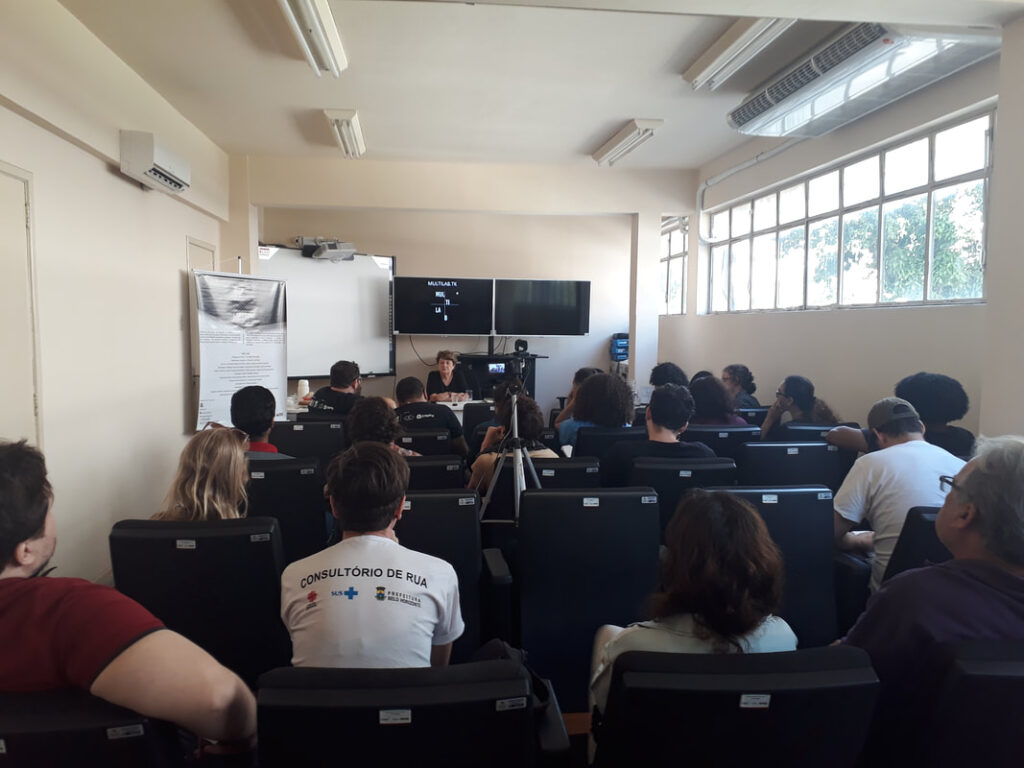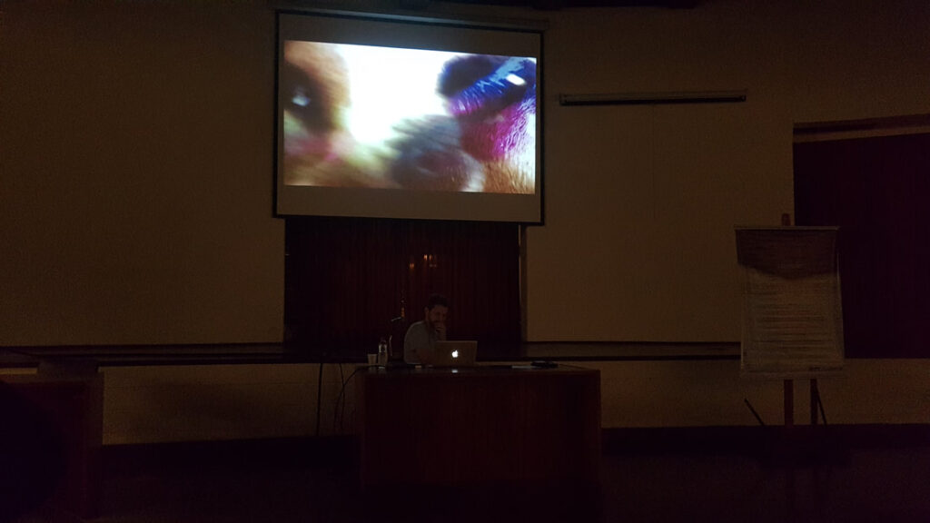 Nossa palestra com professor e artista André Hallack discutiu as semelhanças e distanciamentos entre vídeo-documentário e videoarte. O palestrante expôs um pouco de sua trajetória dentro da produtora Trem Chic VideoLab e falou sobre o mercado local para produção de cinema e de novas perspectivas.